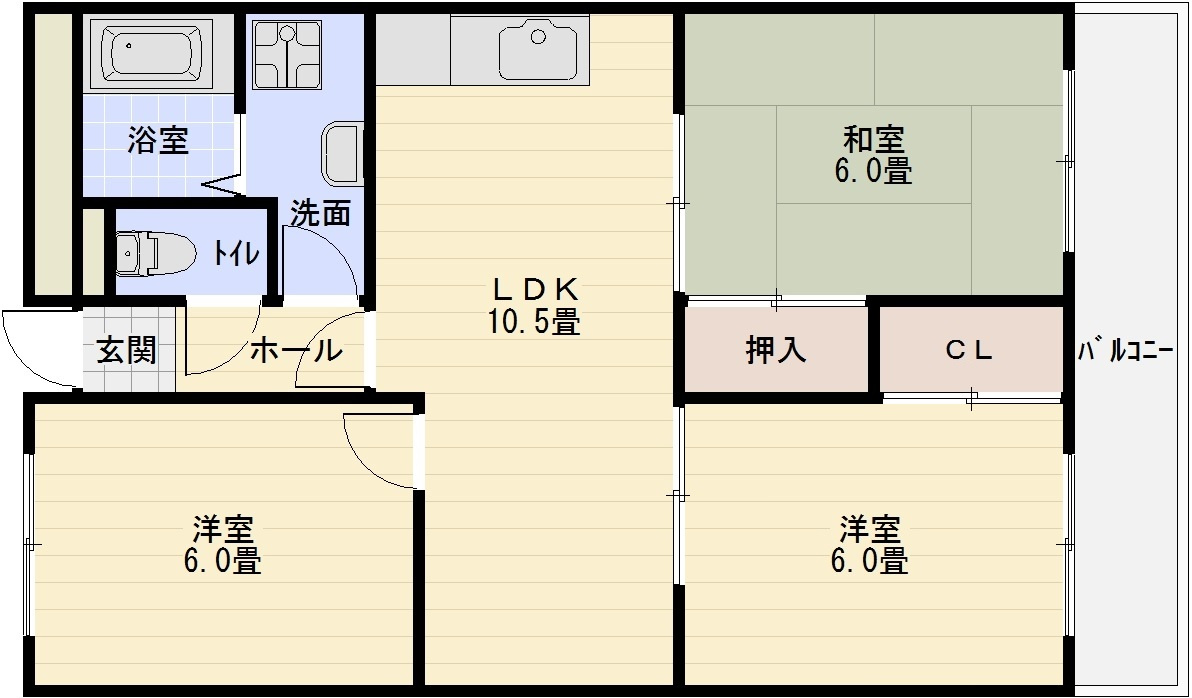 洋室 6.0帖/和室 6.0帖/LDK 9.5帖 - 向き